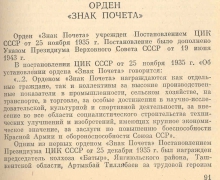 25 ноября 1935 года Центральный Исполнительный комитет — предшественник Верховного Совета СССР — учредил государственную награду — орден «Знак Почета» для награждения за высокие достижения в производстве, научно-исследовательской, государственной, социально-культурной, спортивной и иной общественно полезной деятельности, а также за проявления гражданской доблести.
